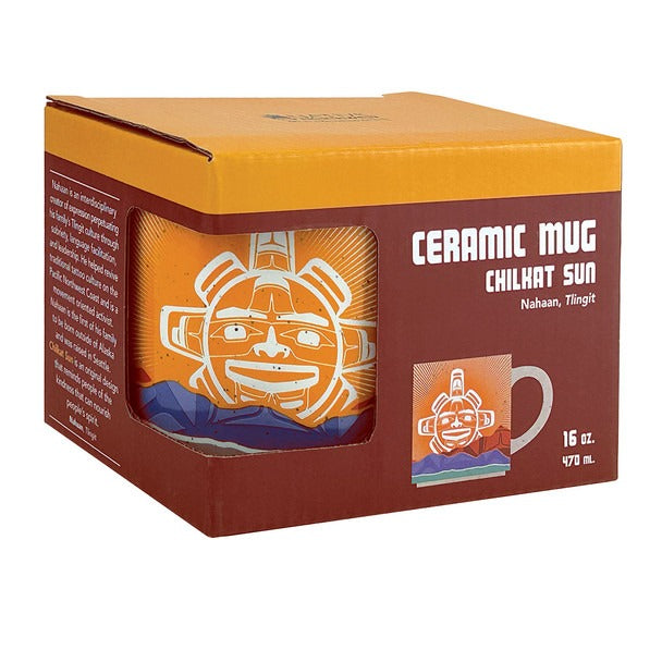 Start your day with the Chilkat Sun Ceramic Mug by Nahaan, celebrating Tlingit artistry. This 16oz mug features authentic Indigenous design on a speckled matte exterior with a glossy coloured interior for a striking look. Perfect for coffee, tea, or gifting, it pairs beautifully with our matching 3oz espresso mugs. Each set of two comes in a colourful gift box, making it an ideal present for friends and family. Bring Northern BC culture to your morning ritual with this unique piece of functional art.