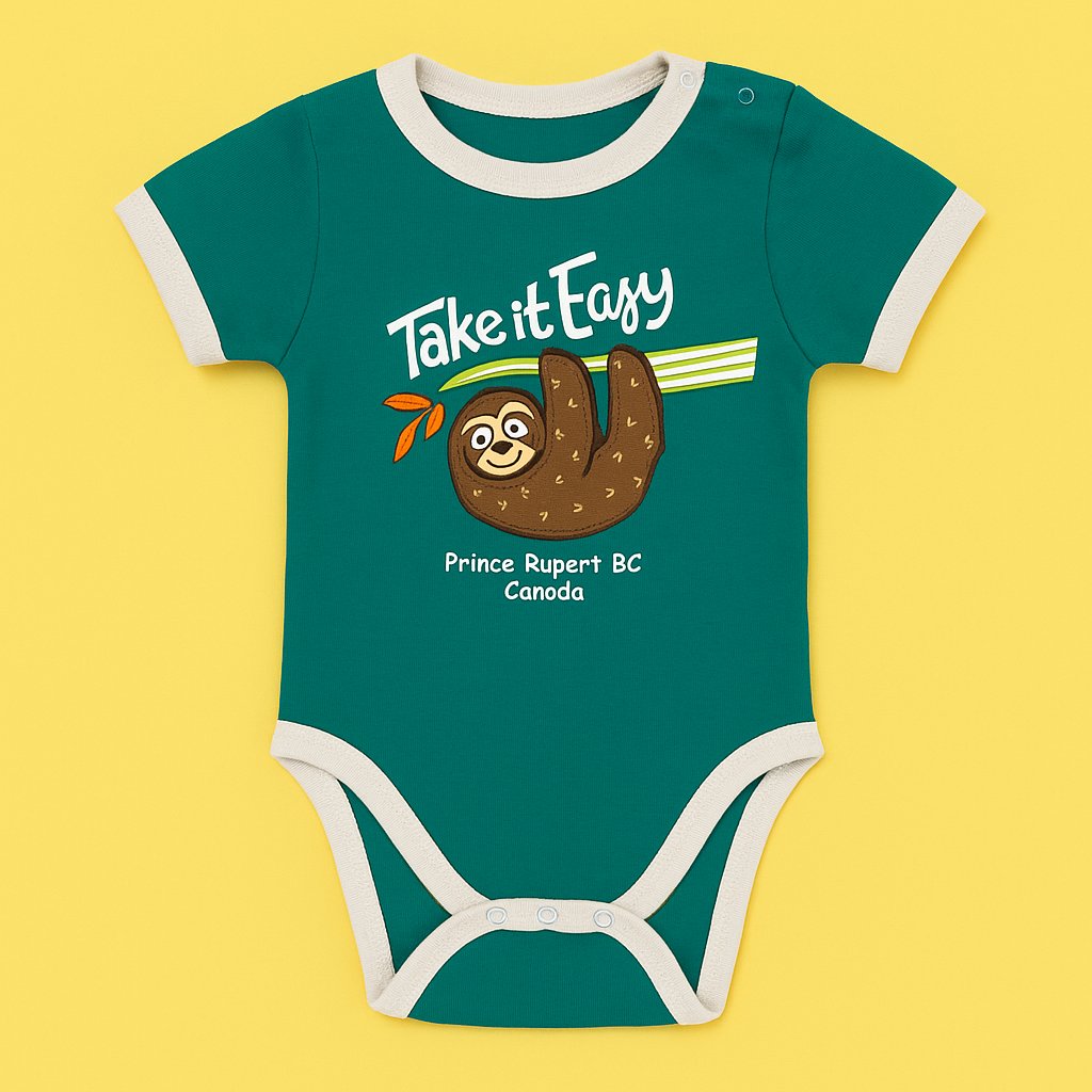 This LazyOne infant creeper is all about comfort and charm. Made from 100% soft cotton, it features a playful sloth and “Take It Easy” design with Prince Rupert BC, Canada detail. Snap closures make changes quick and easy. Available in 6M, 12M, and 18M.